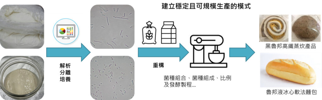 在經濟部技術處科技專案計畫的支持下,財團法人食品工業發展研究所整合微生物菌相分析、菌株分離、保存、發酵及劑型等技術,透過解析魯邦液的菌相組成,進行菌株分離,將其關鍵菌株與食材及原料進行重構,將烘焙菌庫所收集的酵母菌/乳酸菌組成複合菌酛,以支援烘焙蒸炊產業建立可規模化生產的魯邦液產品。同時亦透過科學分析,設立具品質關聯性的關鍵管制點,以利產品批次間品質穩定,解決魯邦液難以規模化及穩定化之瓶頸。